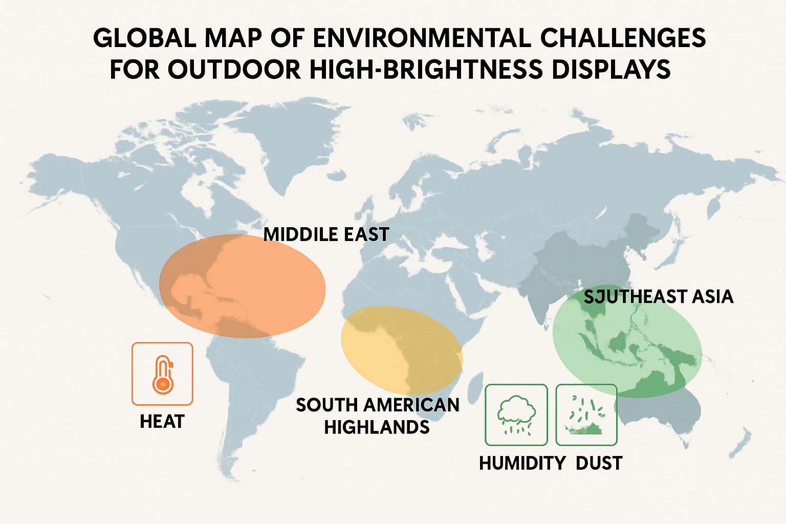 Figure: 4: Global map of environmental challenges for outdoor high-brightness displays, showing regional variations in temperature, solar intensity, and environmental factors*