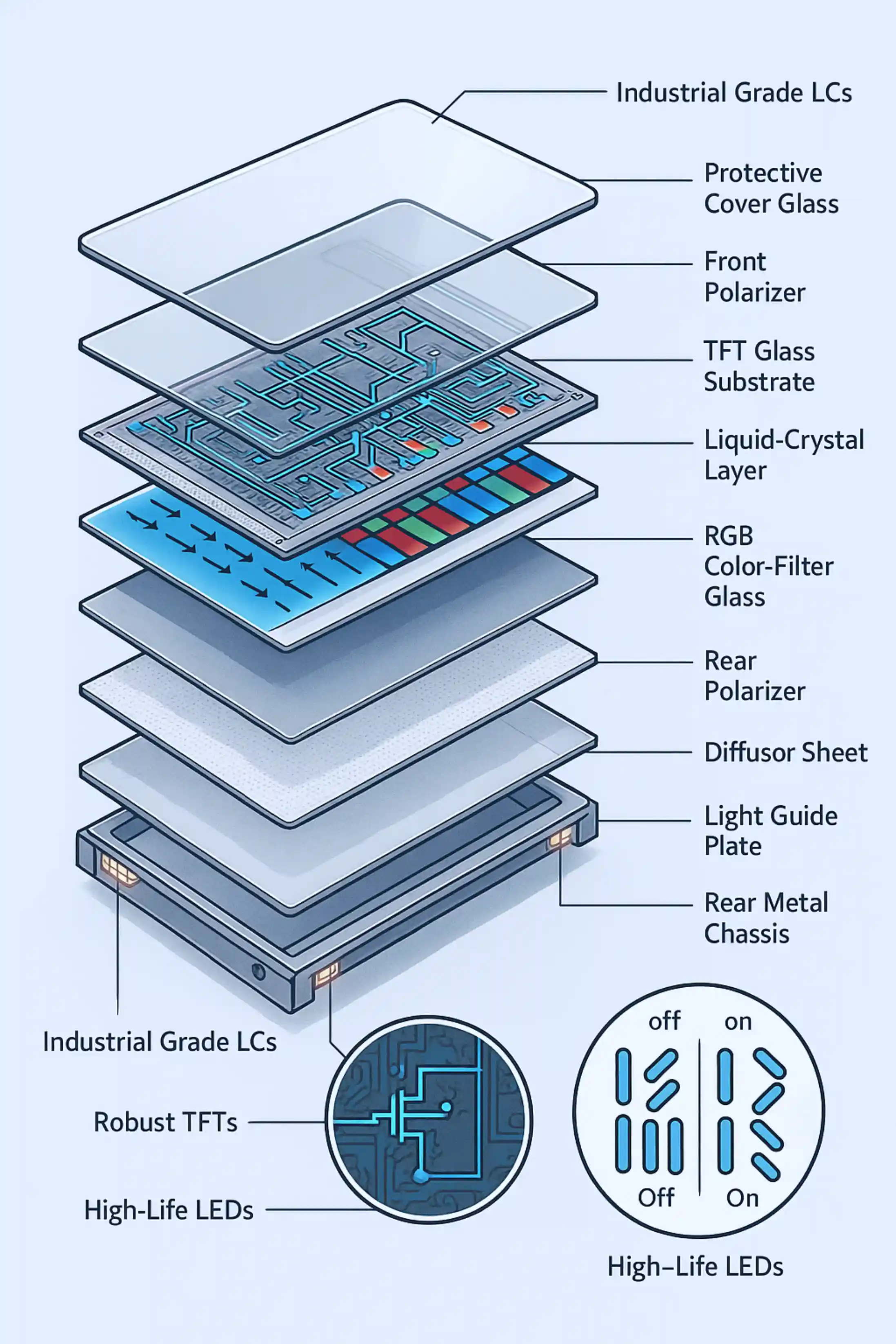 Industrial LCD panels use specialized liquid crystal formulations and robust TFT arrays that resist image retention and pixel defects under continuous operation.