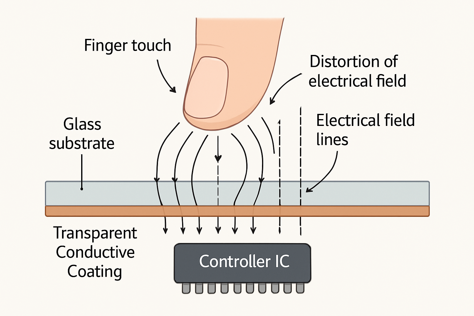 Capacitive touchscreen technology detects touch by measuring changes in an electrical field rather than physical pressure, using a glass substrate with a transparent conductive coating.