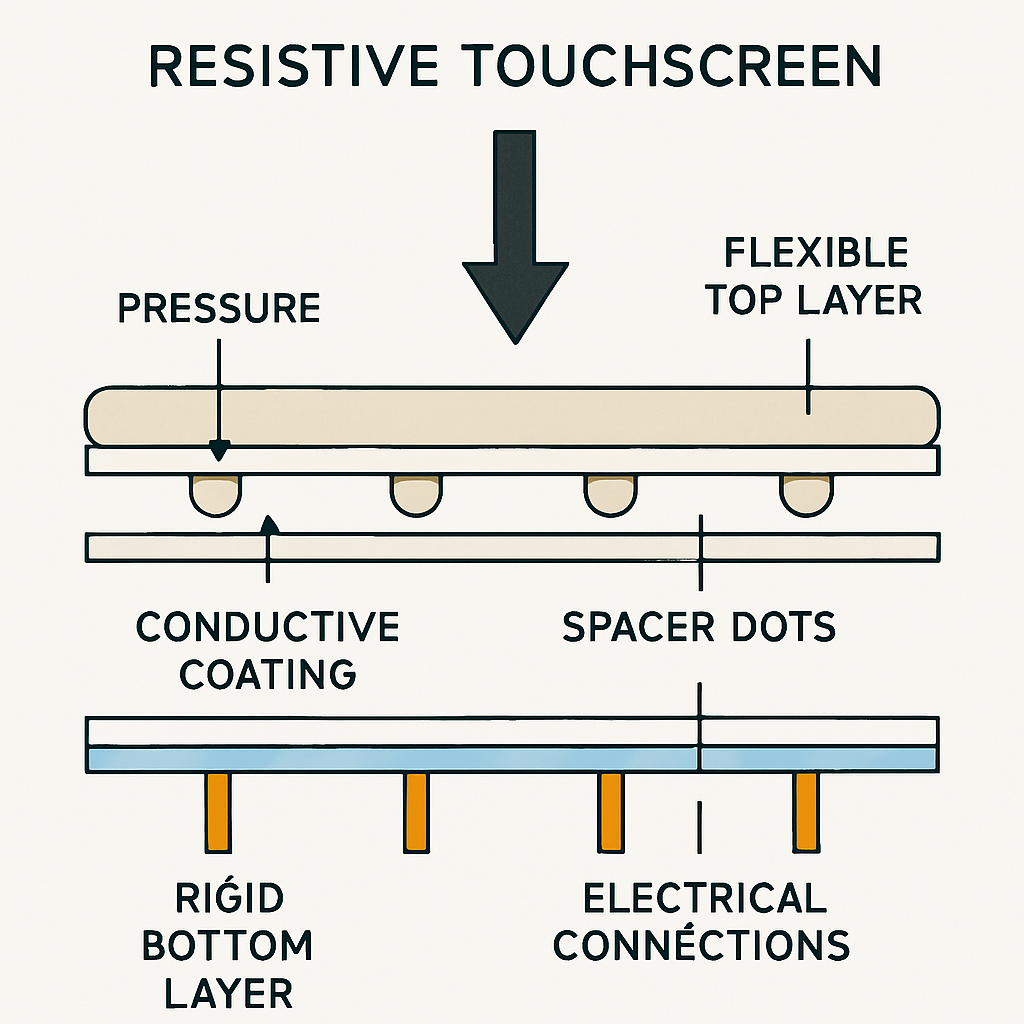 Resistive touchscreen technology relies on pressure to detect touch inputs, using a multi-layer construction with conductive layers separated by spacer dots.