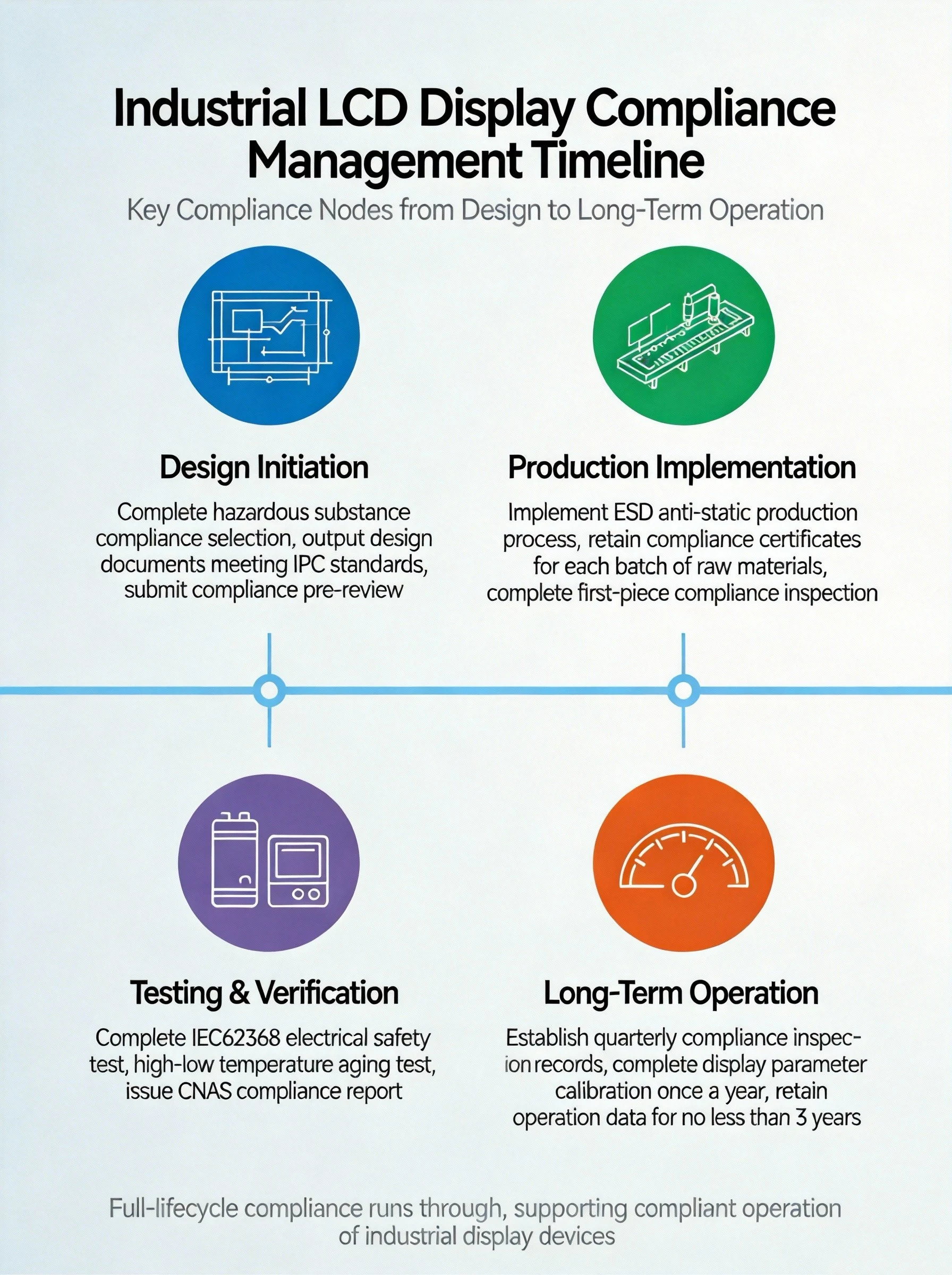 Compliance is not a one-time event achieved at product launch. For industrial LCD screens, it must be maintained throughout the system’s operational life.